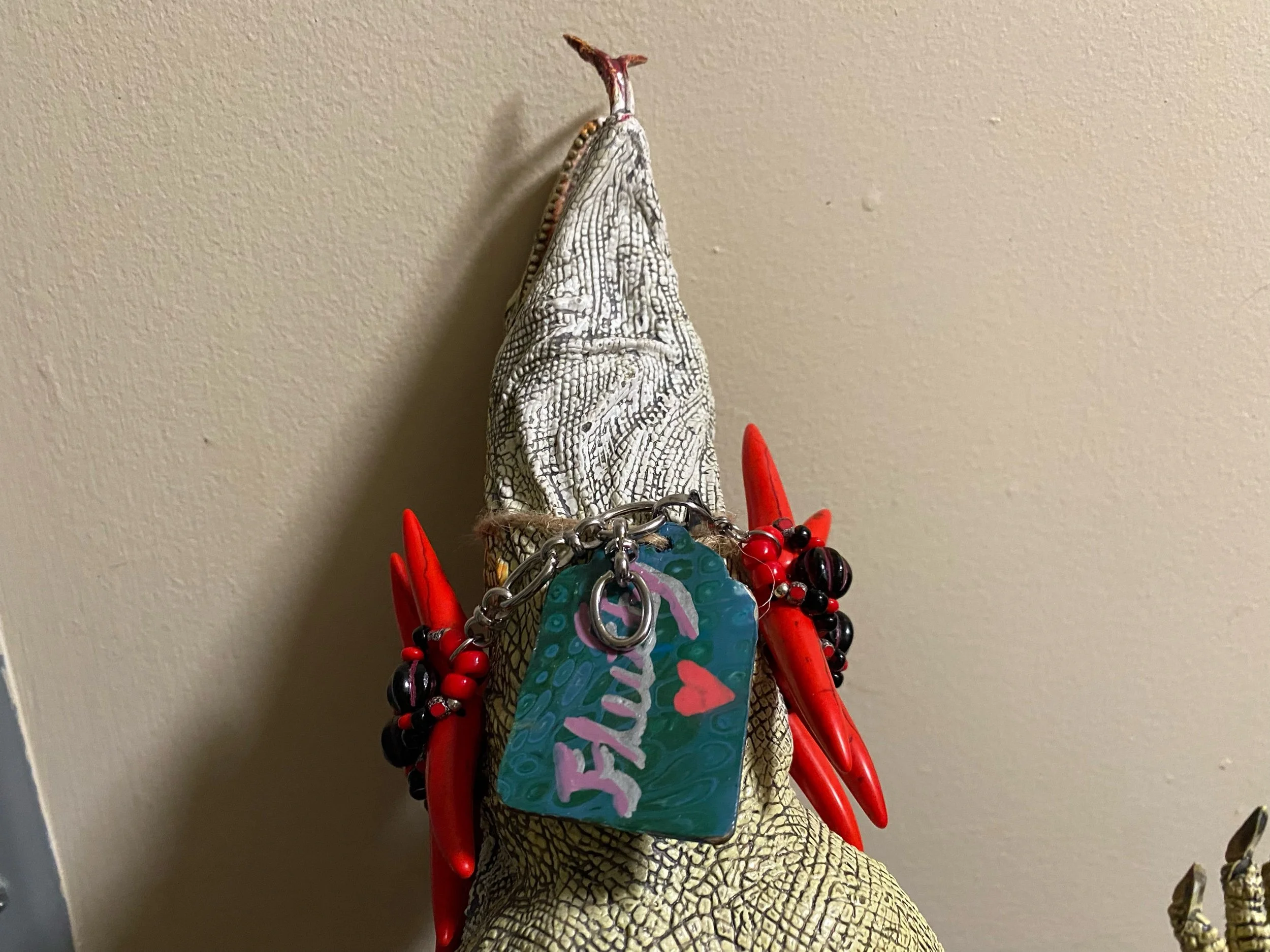 I was inspired by Miriam Shimon’s “Thalia Tooth” pattern that I’ve made before, but Komodogenesis is my own colossal rendition since we’re all about maximalism at Varanid Paradise! Fluffy had to come out and model it! (I modeled it too upon popular request, to show what it looks like on a human instead of a varanid, vinyl or real.)