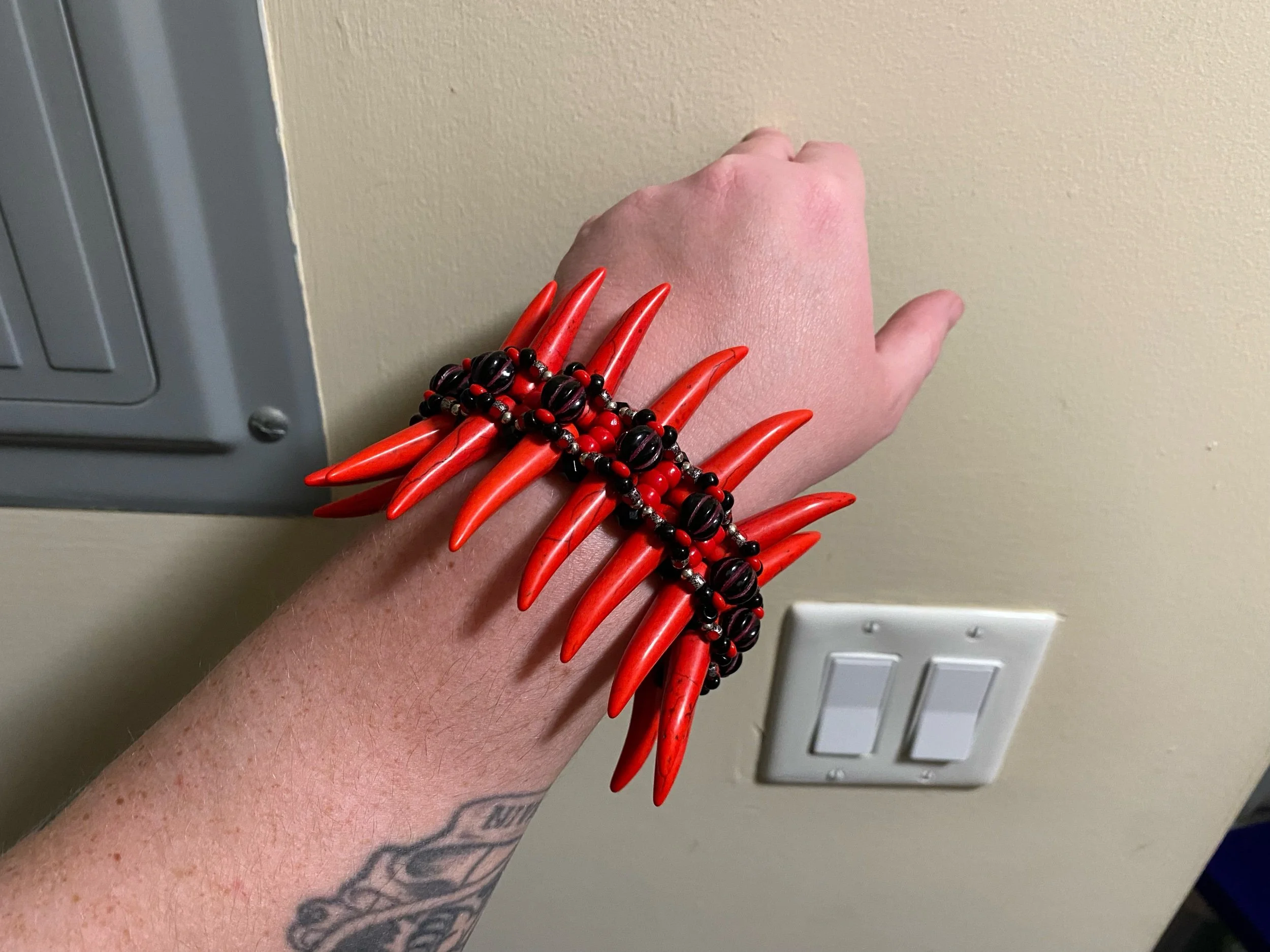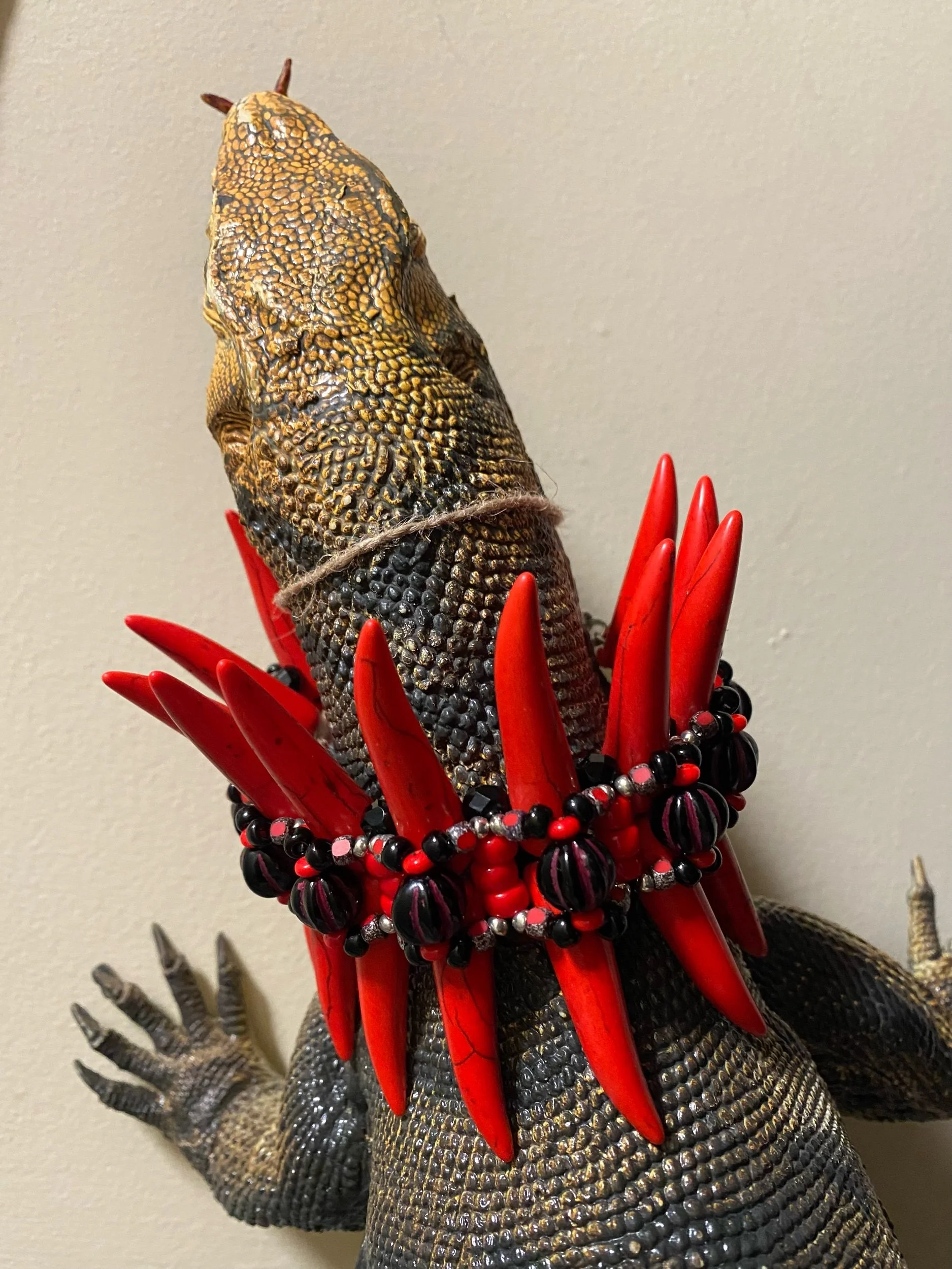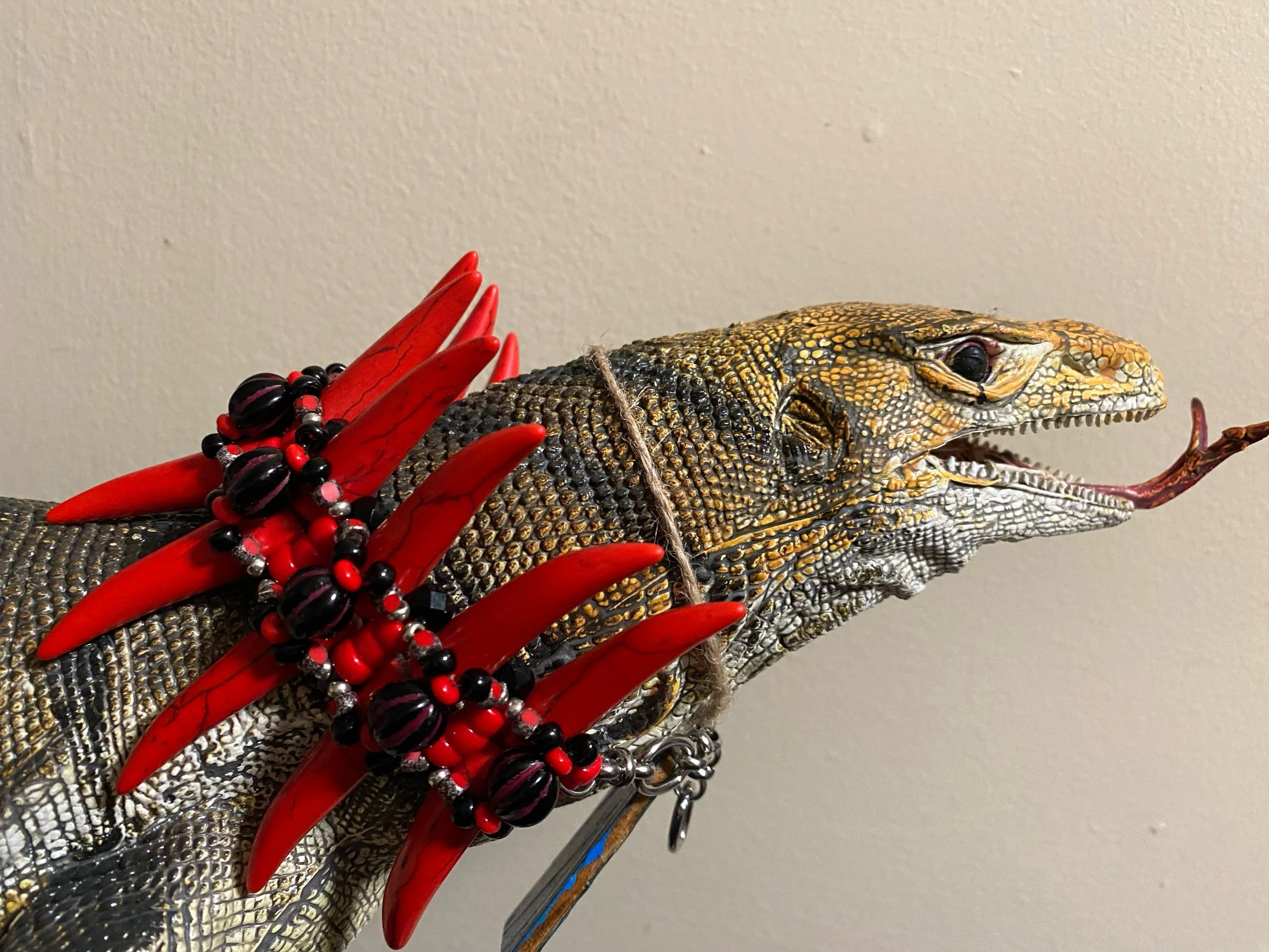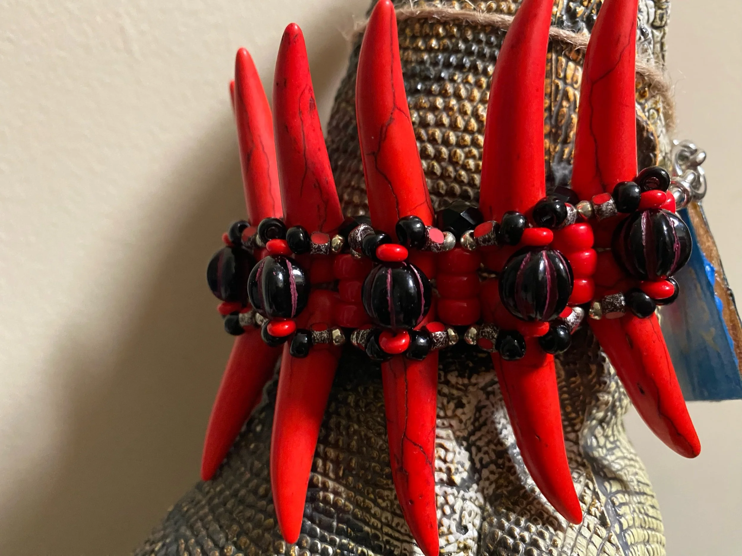 Giant howlite dragon teeth in bright red colors make up the bulk of this show-stopping cuff. It is woven together with tough but flexible 10-lb Fireline, black and red Czech glass striped melon beads, and Czech and Japanese seed beads in a classic red, black, and silver. It’s pleasantly heavy, metal AF, and will make for one of the coolest conversation pieces EVER.