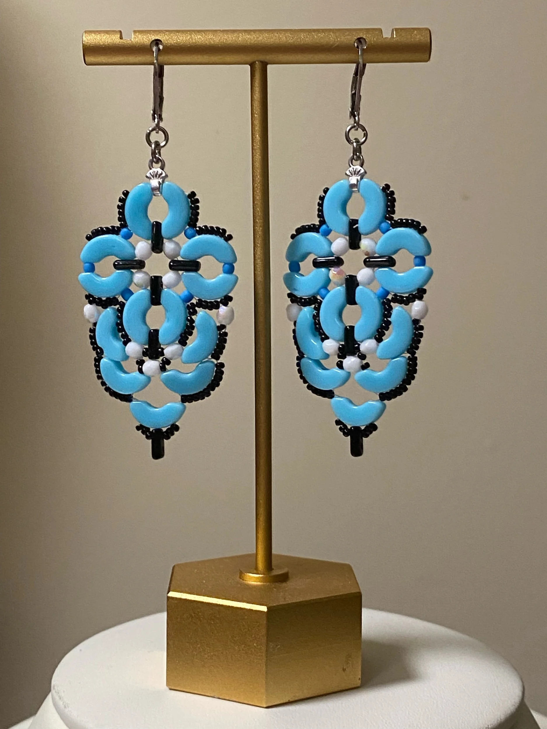I summoned that Art Deco revival of the 80s when I picked the colors for these beautiful beaded earrings: bright turquoise blue with classic black. Remember when colorblock was EVERYWHERE then? But I also included a touch of 2020s unicorn skin.