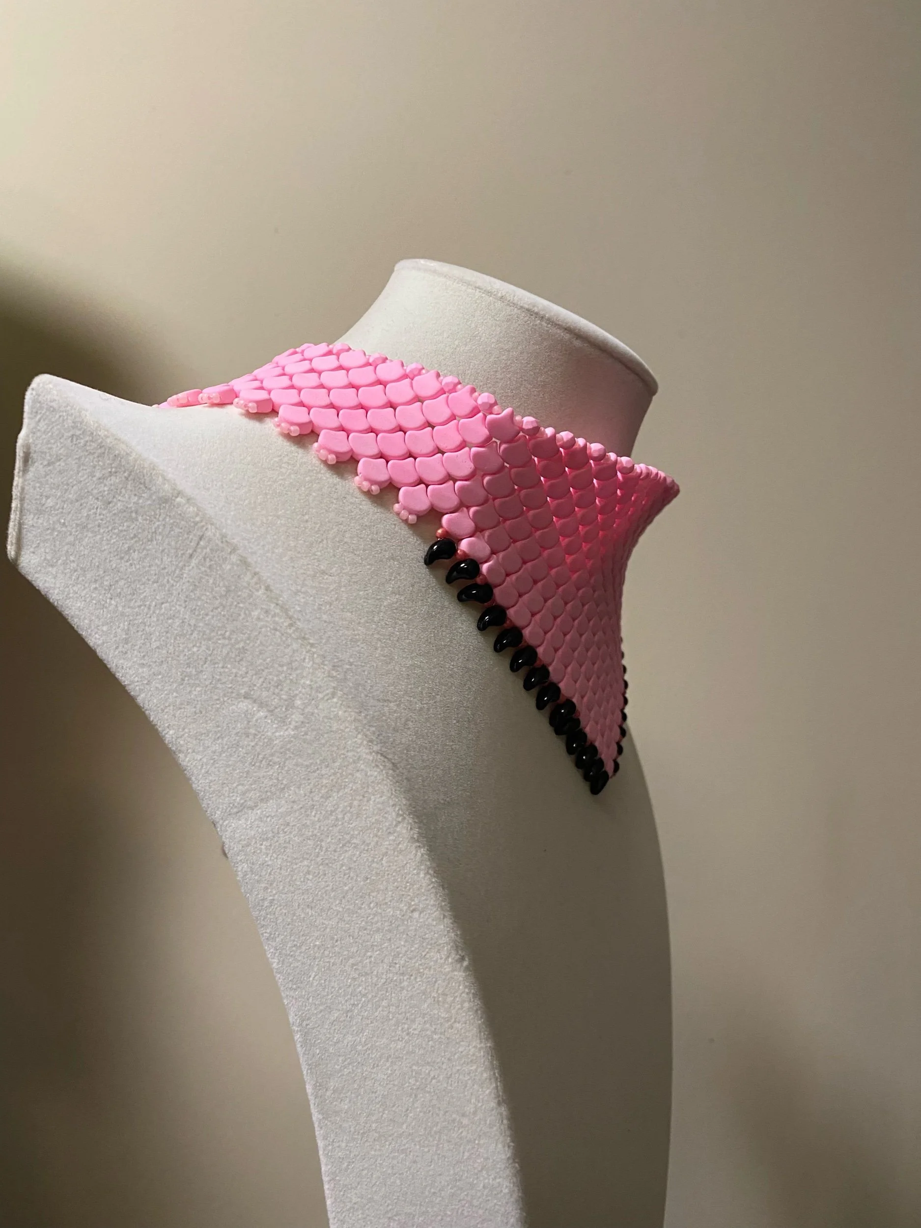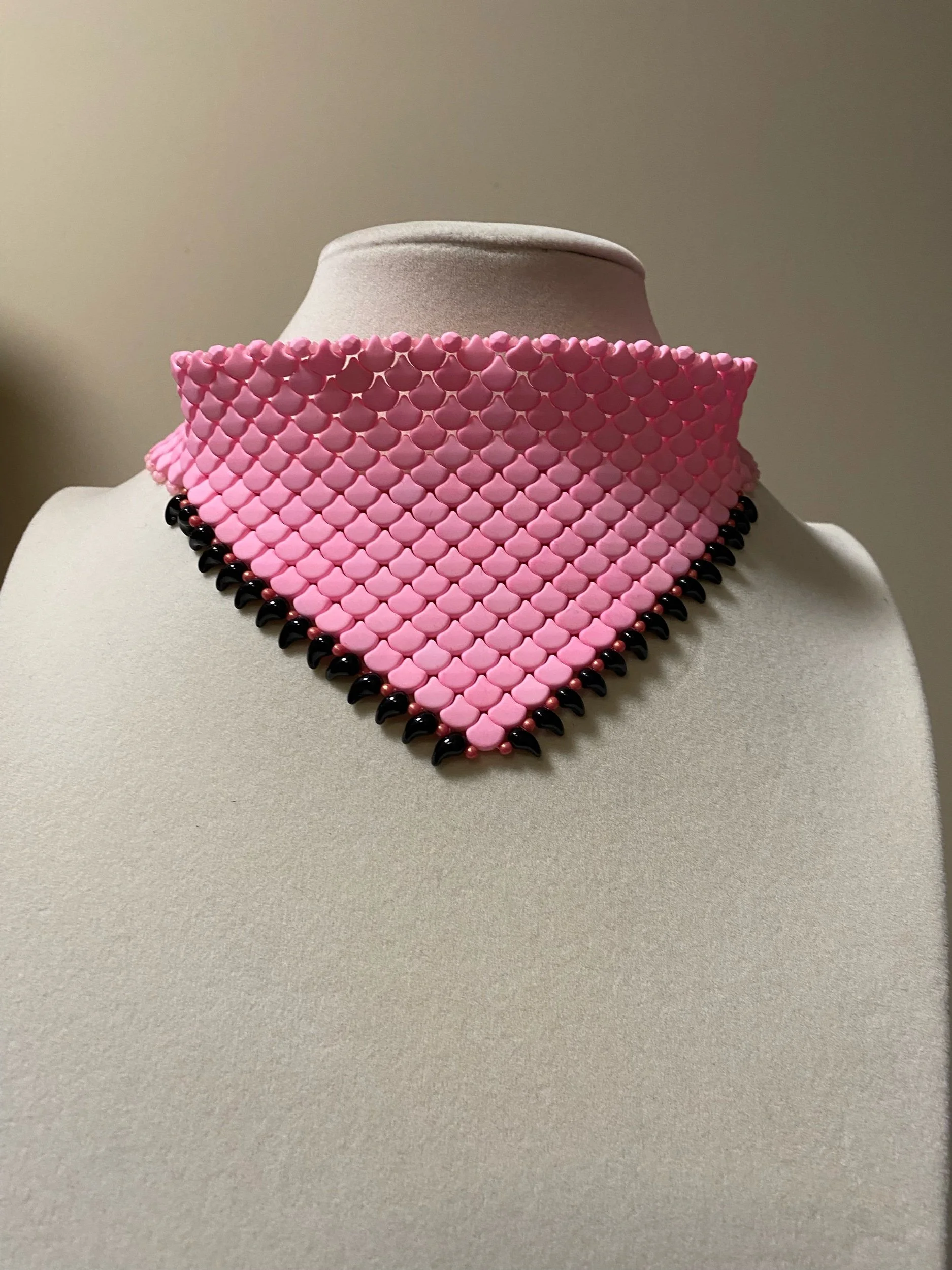 Woven with thermal-bonded and color-matched Wildfire bead thread, kawaii matte pastel pink comes together with shiny black dragon teeth and tiny red Czech glass pearls for one-of-kind, head-turning neckwear that’ll be the talk of festivals for years to come.