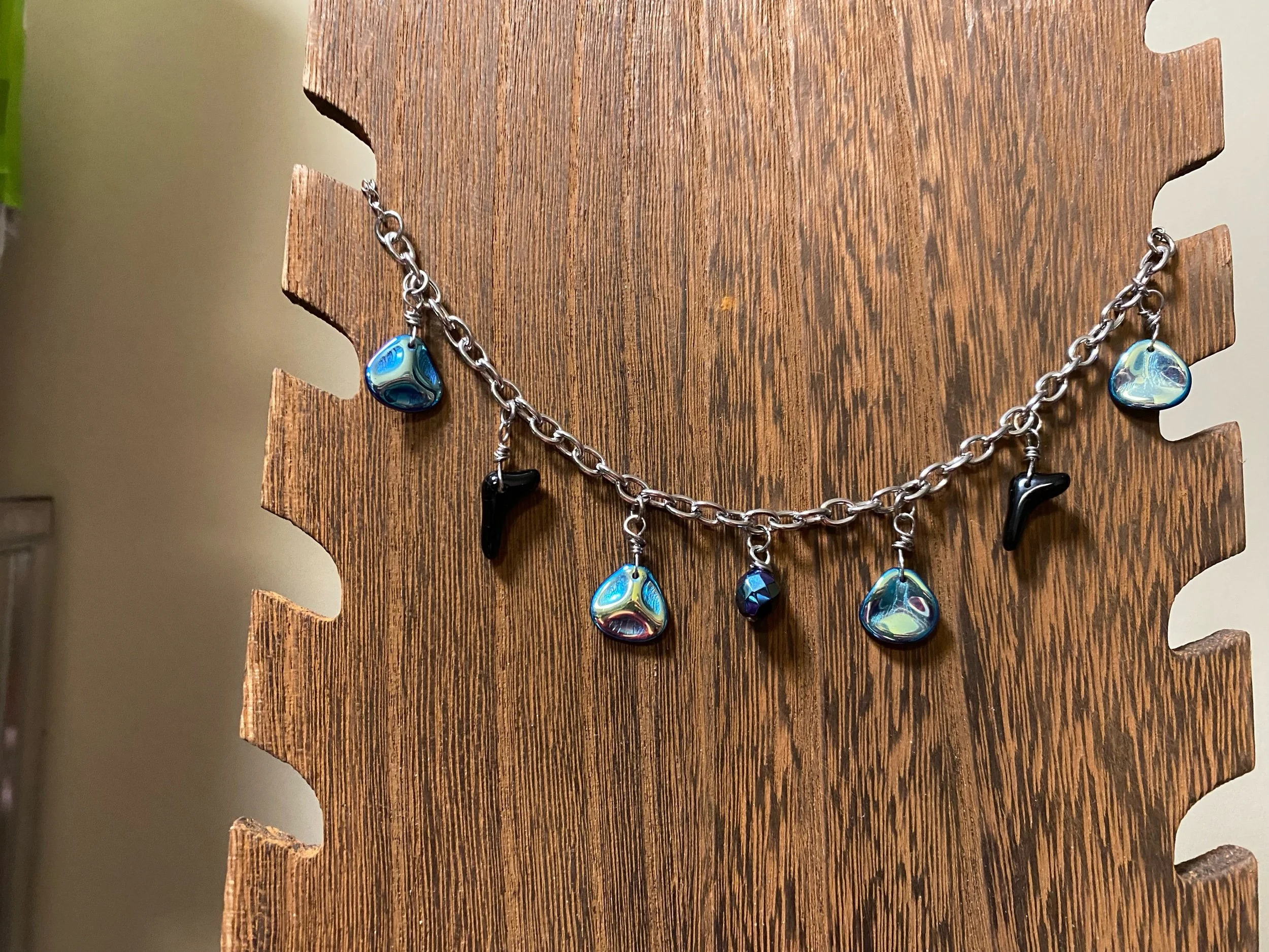 Beautiful black AB/dark unicorn dragon scales are flanked by funky black twigs and a little gem in the same color.