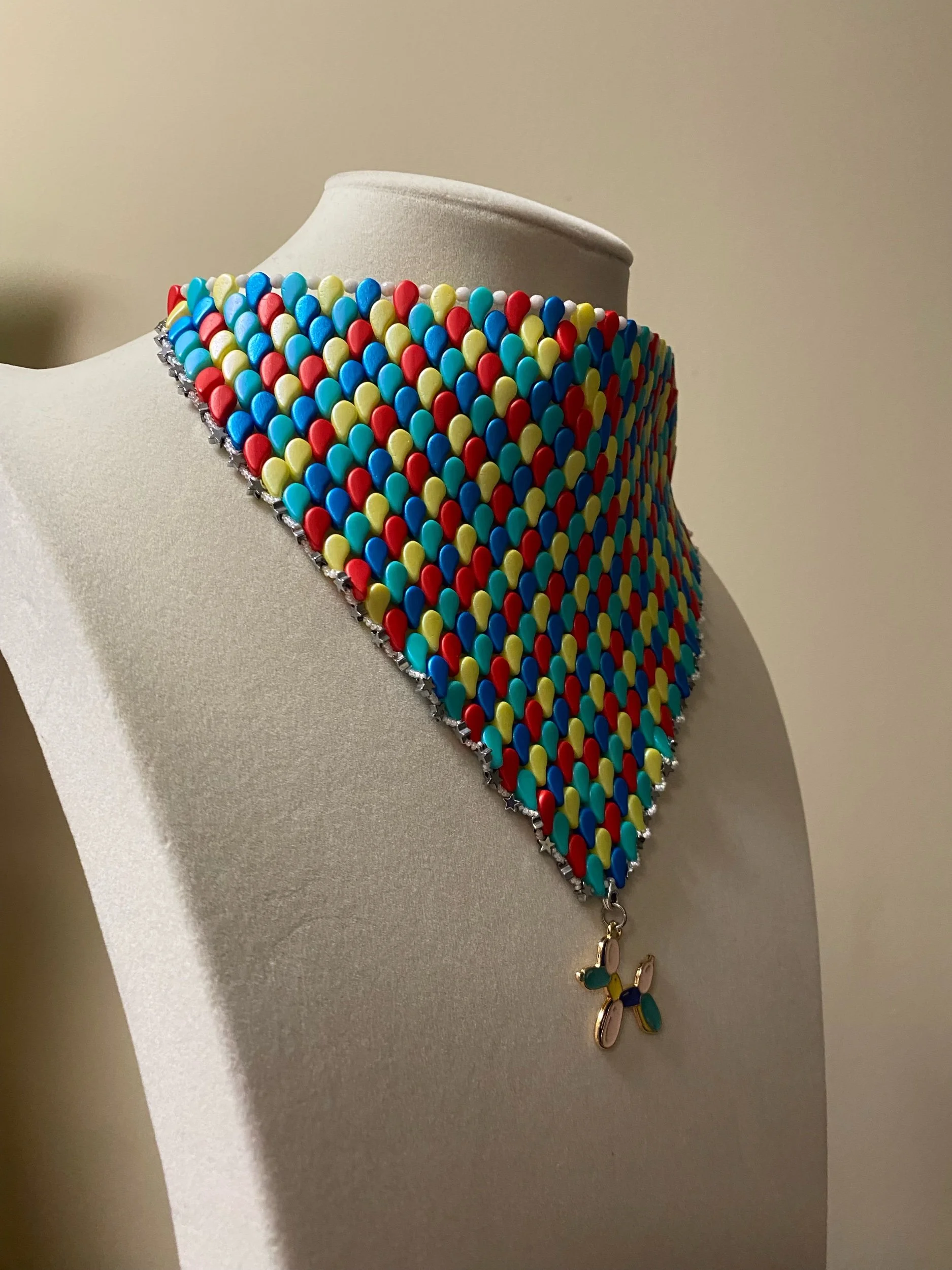 This unique hand-beaded sheath necklace resembles feathers in bright circus-inspired colors made from fine Czech glass, with tiny Japanese seed beads and colorful hematite stars on the edges. At the tip, there’s a colorful enamel balloon animal!