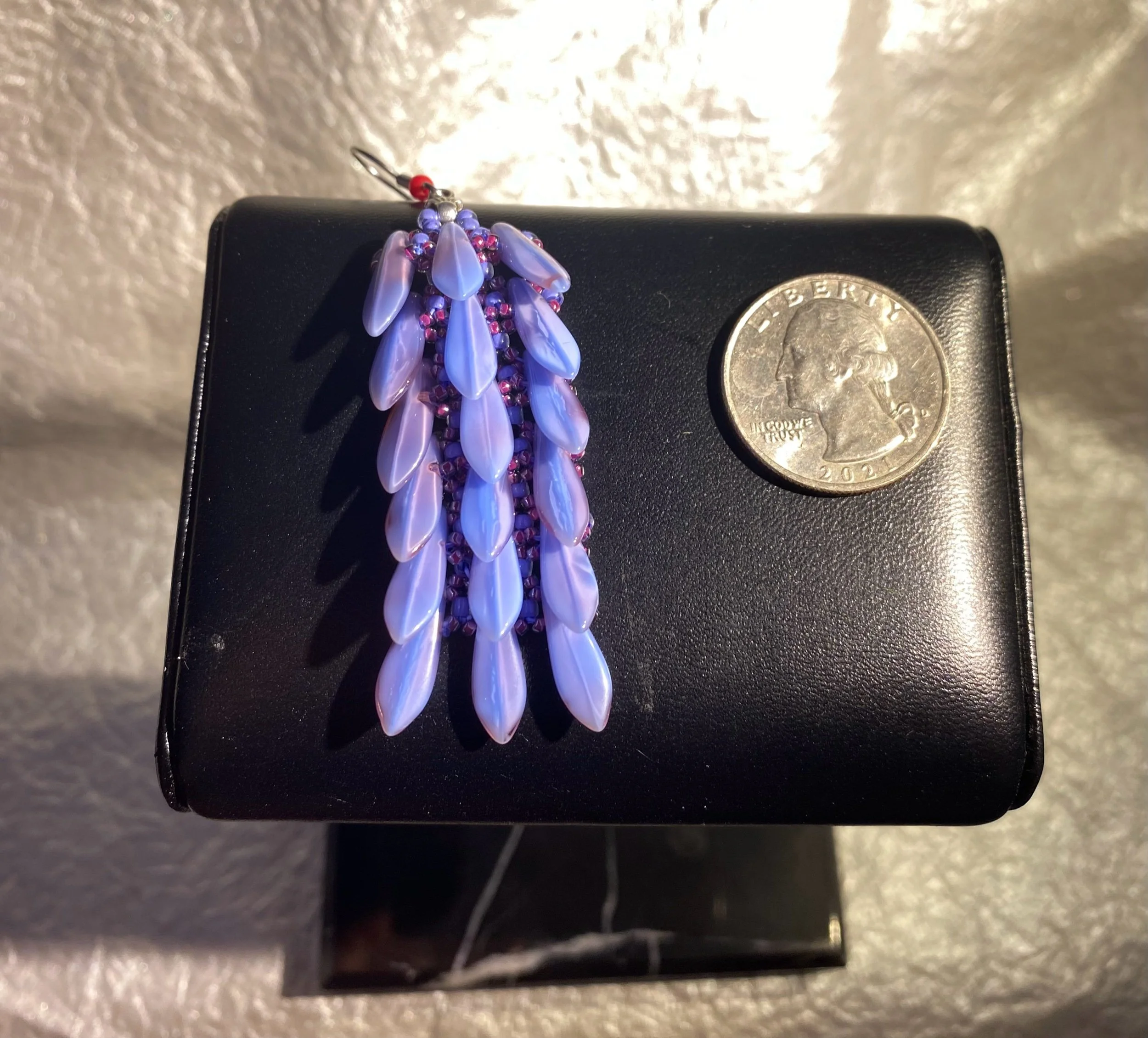 Fine Czech glass beads form lovely reptile scales with several Japanese seed beads woven with Fireline. The bright cranberry red seed beads contrast beautifully with the marled periwinkle purple. The backs are so smooth, they feel like petting a tegu!